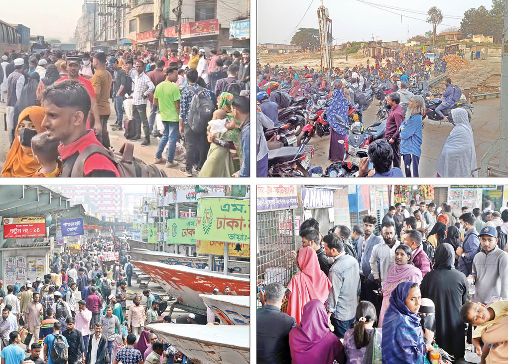 Clockwise from left, homegoers wait at Gazipur Chowrasta for vehicles amid thin traffic, people crowd the Aricha-Paturia Ghat, passengers throng the Mohakhali Bus Terminal, people swarm out of the Sadarghat Launch Terminal, as they leave Dhaka for 4-day holiday, on Tuesday. — New Age photo