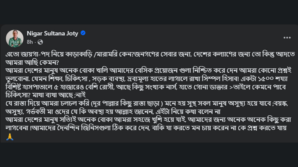 জ্যোতি লেখেন, ‘এত জায়গা-পদ নিয়ে কেন এই কাড়াকাড়ি ও সংঘর্ষ? আমরা কি সত্যিই জনগণের সেবা আর দেশের কল্যাণের জন্য কাজ করছি? আমরা সাধারণ মানুষ খুব বেশি কিছু চাই না—শুধু আমাদের মৌলিক চাহিদাগুলো নিশ্চিত করে দিন। শিক্ষা, চিকিৎসা, ভালো সড়ক ব্যবস্থা এবং নিত্যপ্রয়োজনীয় পণ্যের দাম নাগালের মধ্যে রাখলেই আমরা সন্তুষ্ট।’